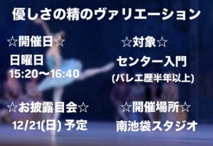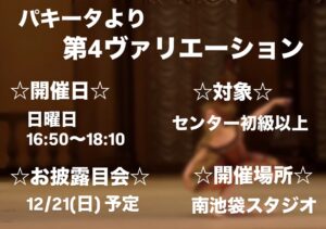 12月までの4ヶ月(全12回+お披露目会)をかけてヴァリエーションを一曲練習します。